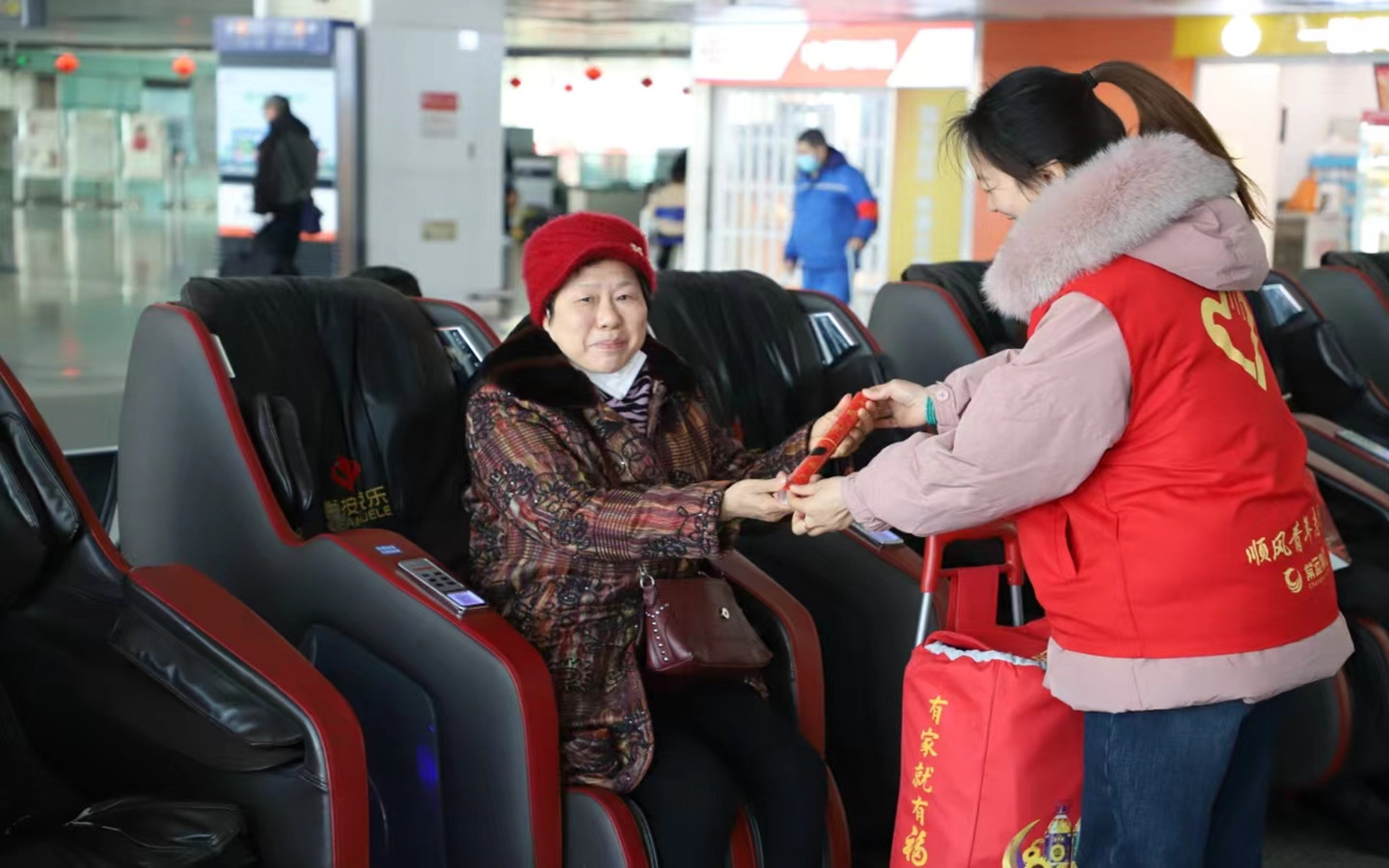 啟動儀式后,2024春運志愿服務活動正式開始,首批上崗的10名順風志愿者,分布在進站口、取票處、檢票口等處,為旅客送上了新年祝福,提供購票指導、提拿行李、幫扶引導等服務,為廣大旅客打造一條溫暖的“回家路”。