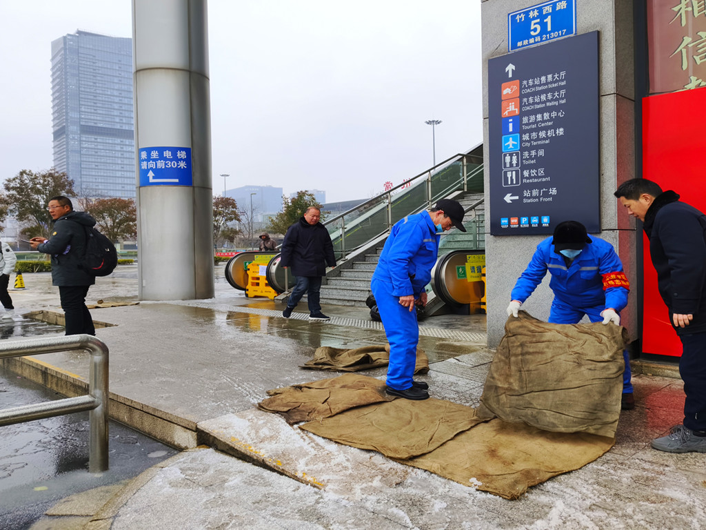 公司通過GPS動態(tài)監(jiān)控平臺掌握營運車輛在途狀況,及時提醒路況信息,要求減速慢行。為預(yù)防雪后濕滑及冰凍,常州各車站組織人員在旅客進出口處、電梯口、車輛上下坡處等重點結(jié)冰區(qū)域撒鹽并鋪設(shè)防滑麻袋,在進站候車扶梯、樓梯處做好安全提醒,全力保障旅客出行安全。23日凌晨時分,公司安管人員帶隊上路上線,查看道路情況,并根據(jù)探得的道路狀況,對班次作出了調(diào)整,確保春運期間旅客的出行安全。